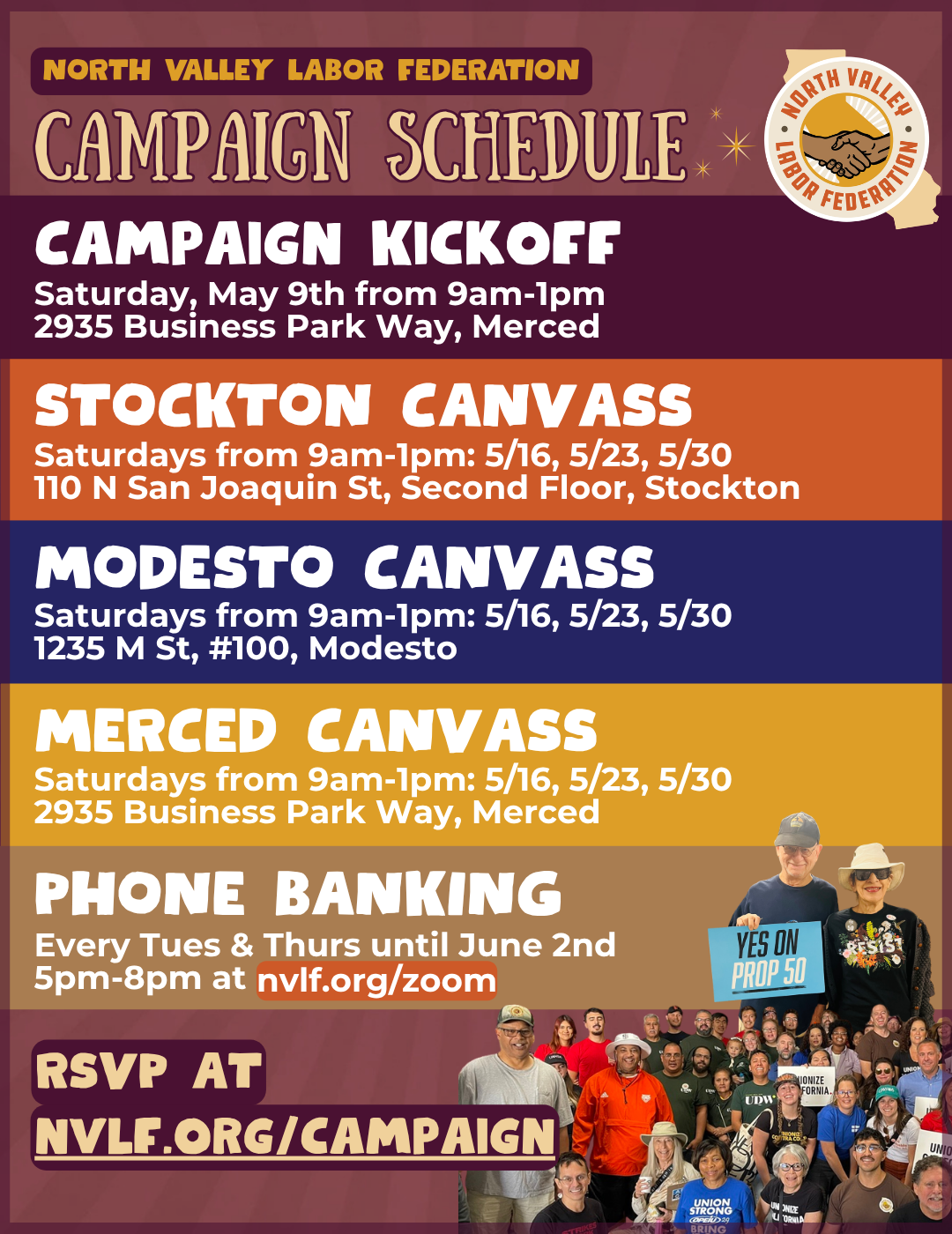 CAMPAIGN SCHEDULE This Primary Election season, we’re knocking on doors and making calls for pro-worker candidates. See the schedule below and sign up for volunteer shifts HERE. You can also check out our Google Calendar. Excited to have you join our campaign.Let’s win big for workers this June!